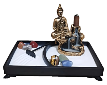 Transforme seu ambiente em um refúgio de tranquilidade com este Jardim Zen completo, composto por areia branca, pedras naturais e uma imagem serena do Buda em meditação.